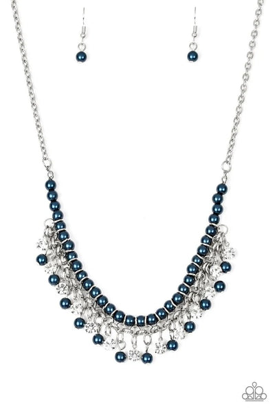 Infused with silver chain, blue pearls are threaded along an invisible wire below the collar. Matching blue pearls and glittery white rhinestones swing from the pearly strand, creating a flirtatious fringe below the collar. Features an adjustable clasp closure.