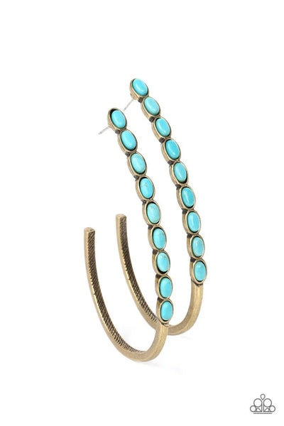 Oval turquoise stones are pressed into the front of a dramatically oversized brass j-shaped hoop, adding an artisan twist to the trendsetting design. Earring attaches to a standard post fitting. Hoop measures approximately 2" in diameter.