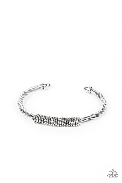 Twisted silver wire wraps around the center of a spun silver cuff, creating a rustic center