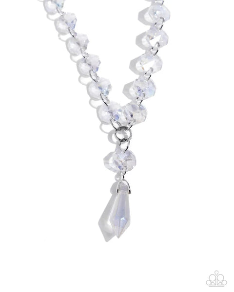 Adorn your neckline with a stunning necklace that showcases opalescent, UV shimmer and glimmers of faceted white beads that dance along a sleek silver chain. This eye-catching design leads to a captivating prismatic bead, adding a final touch of brilliance. Complete with an adjustable clasp for comfort, please note that the vibrant colors may vary, enhancing each unique piece.
