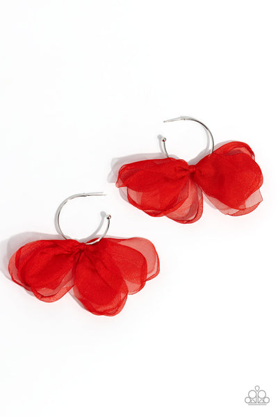 A small, skinny, shiny silver hoop curves around the ear in a timeless fashion. A shiny silver ball is affixed to the end of the hoop, reminiscent of a barbell fitting. A red chiffon bow slides along the curvature of the hoop, creating a graceful pop of color. Earring attaches to a standard post fitting. Hoop measures approximately 1" in diameter.