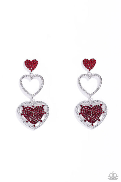 A red rhinestone-encrusted silver heart, white rhinestone-encrusted silver heart frame, and white and red rhinestone-encrusted layered heart frame gradually increase in size as they delicately interconnect and stack into a dazzling lure for an elegant effervescence. Earring attaches to a standard post fitting.