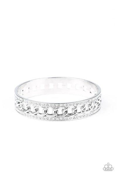 Bordered in rows of blinding white rhinestones, a glistening strand of silver chain glamorously links around the wrist, coalescing into a unapologetically glittery bangle. Elevate your style with the Paparazzi Bracelet ~ Couture Court - White, a stunning addition to your bracelet collection. Explore more glamorous jewelry options from Paparazzi Bracelets collection