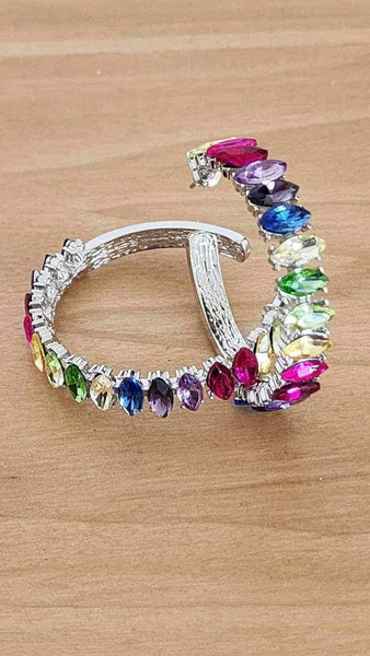 Featuring pronged silver fittings, a sparkly series of marquise-cut rhinestones in varying sizes and opacities are splashed in hues of purple, blue, light blue, baby pink, pink, and green as they fan out below the collar for a vibrant statement. Fuchsia and white round gems in varying sizes sporadically cluster around the marquise-cuts for additional shimmer in the geometric, refined display.