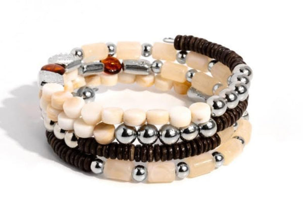 Threaded along a coiled wire, a collection of silver beads, floral-stamped silver beads, light brown acrylics, transparent brown discs, brown stone discs, and light brown-swirled clear cylinder beads pattern and stack atop the wrist creating a colorful infinity wrap-style bracelet.