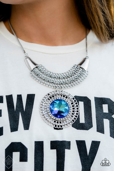 Rows of oversized chain-link stack into a crescent-shaped frame that is anchored by shiny silver caps on each side. Below the metallic mesh, an exaggerated blue gem is wrapped in a border of hematite and rippling chain-link frames, creating a hypnotic pendant that swings dramatically. The elaborate statement piece is suspended from a sleek silver snake chain, emphasizing the metallic sheen emanating from the design. Features an adjustable clasp closure.