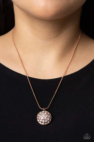 Cascading from a shiny copper snake chain, a sparkly white rhinestone-encrusted ornament and a classic white pearl meet to create a half-and-half refined pendant. Features an adjustable clasp closure.
