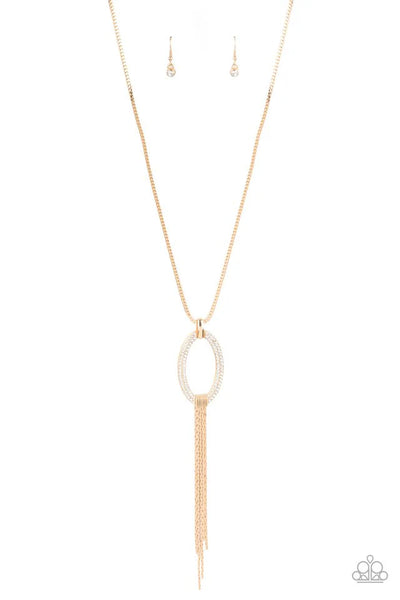 This stunning piece features an oval gold frame encrusted in glittery white rhinestones, sliding along an edgy gold box chain. The pendant is accented with flattened decorative gold chains that create a sassy tassel. Complete with an adjustable claspclosure, this necklace is a must-have for any fashion-forward individual.