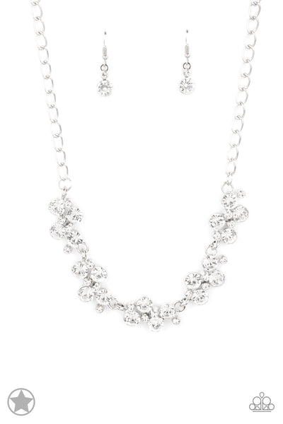 A row of dazzling white rhinestones drapes along the neckline, creating a sparkling display. Daintier white rhinestones are sprinkled along the clusters, adding luminous detail to the timeless design. Features an adjustable clasp closure.