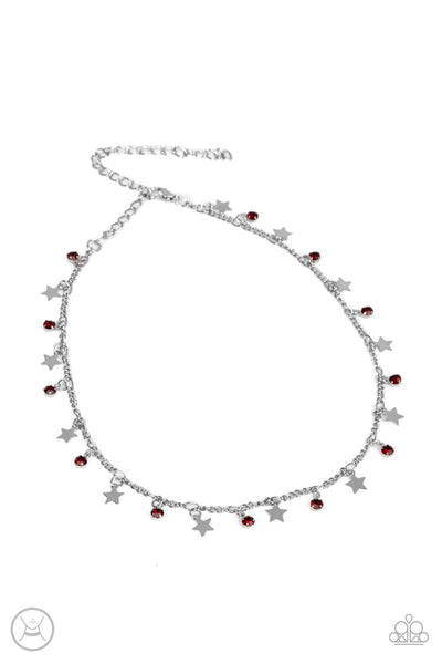 Dainty red rhinestones and flat silver stars twinkle along a classic silver chain around the neck, resulting in a stellar fringe. Features an adjustable clasp closure.
