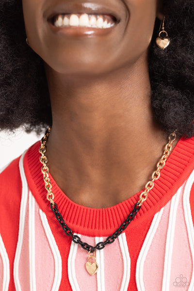 Infused with splashes of black chain, a lengthened oversized high-sheen gold chain dances down the chest for a spunky industrial statement. A dainty hammered gold lock pendant graces the bottom of the necklace, further infusing the design with a touch of romanticism. Features an adjustable clasp closure.
