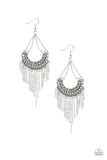 Suspended by chains, a tapered fringe of dainty silver chains stream from the bottom of a white rhinestone encrusted chain-link frame for an edgy fashion. Earring attaches to a standard fishhook fitting.