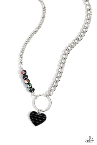 A strand of flat silver curb chain collides with a classic chain and a vivacious collection of black beads, featuring various multicolored splatters across its surface, to create an abstract blend of color and class. The mismatched chains connect to a large silver hoop with a black-striped silver heart dangling at the bottom of the display, infusing the design with additional charm. Features an adjustable clasp closure.
