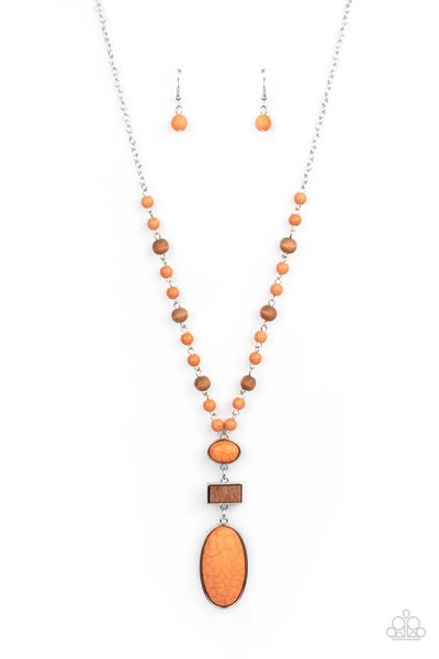 A dainty collection of Rust stone and rustic wooden beads connects into an earthy chain across the chest. Featuring sleek silver frames, oval stones and a rectangular wood frame connect into a dramatically stacked seasonal pendant at the bottom of the colorful display. Features an adjustable clasp closure.