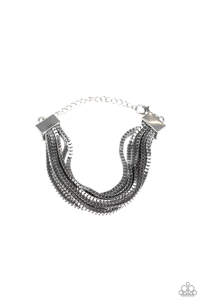 Row after row of glistening gunmetal box chains are strung between two bold gunmetal fittings, creating dramatic industrial inspired layers across the wrist. Features an adjustable clasp closure.