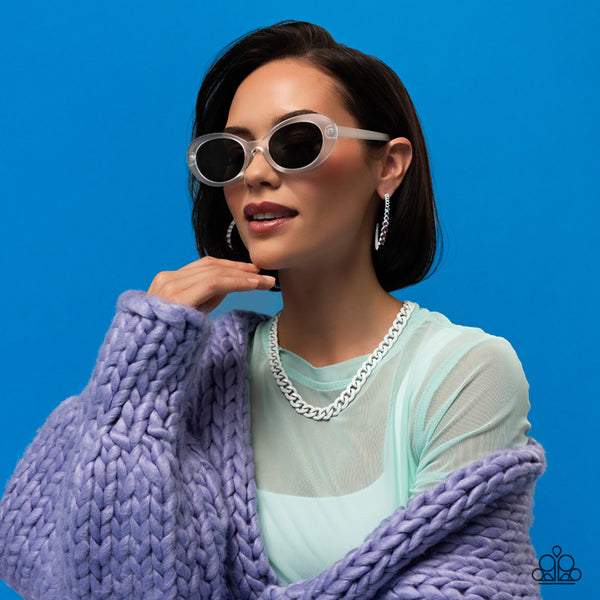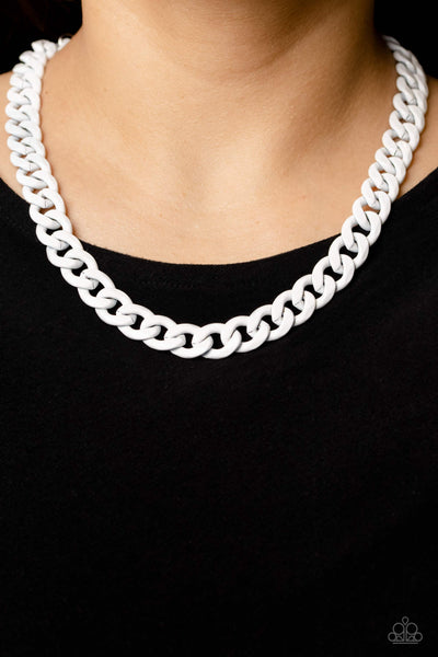 Brushed in a glossy white finish, a classic curb chain drapes across the chest for an attention-grabbing, fashionable pop of color. Features an adjustable clasp closure.