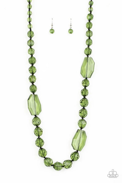 Varying in shape and size, glassy green beads are knotted in place along shiny black cording, creating a dazzling display across the chest. Features an adjustable clasp closure.
