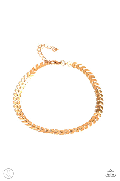 Glistening gold bars join into a dainty V-shaped frame that curves around the ankle for a seasonal look. Features an adjustable clasp closure.