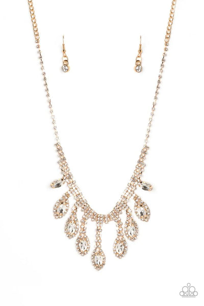 Make a statement with the "Reigning Romance - Gold" necklace from Paparazzi Jewelry. This necklace features an intricate arrangement of gold chains and a striking pendant, making it a perfect accessory for any formal occasion. The pendant is designed with a vintage look, featuring an elegant filigree pattern and a sparkling rhinestone at its center.