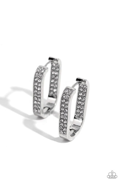 Encrusted in rhinestones along the inner and outer curves, a thick silver bar sleekly curls into a U-shaped hoop, creating a hypnotizing look. Earring attaches to a standard hinge closure fitting. Hoop measures approximately 3/4" in diameter. Sold as one pair of hinge hoop earrings.