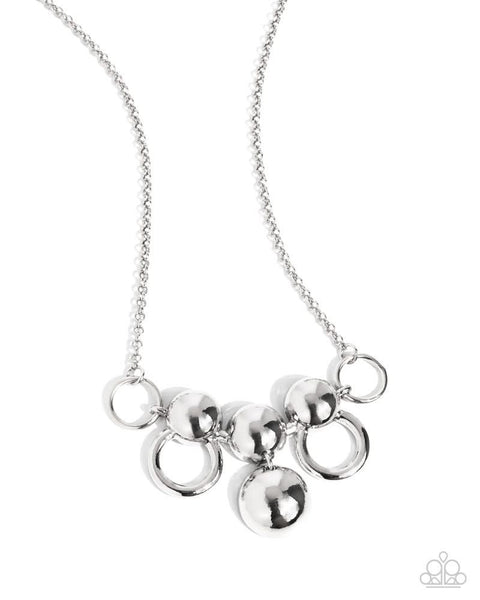 A cluster of oversized silver half-spheres and smooth silver circles interlock at the bottom of a dainty silver chain, creating a bold and minimalist statement. The high-shine finish of the metallic elements adds a sleek and modern touch to the design. Features an adjustable clasp closure.