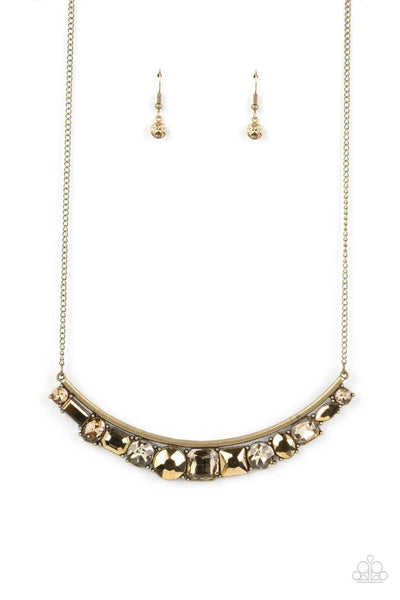 A curved bar of antiqued brass is trimmed with a mashup of glitzy aurum and faceted golden topaz gems that shimmer inside studded brass frames, creating a scintillating sparkle below the collar. Features an adjustable clasp closure.