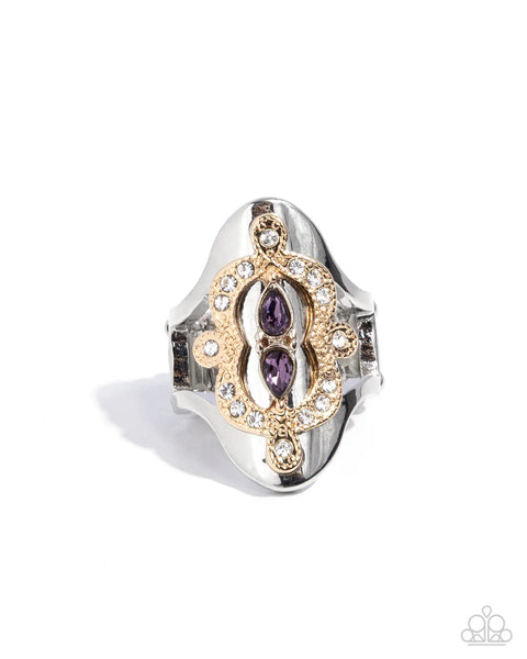 Embellished atop gold-studded filigree, white round rhinestones, and purple teardrop gems glisten and glitter along a curved, scalloped silver frame. The gold filigree along the center of the design allows the skin to peek beneath the regal pattern for a whimsical finish. Features a stretchy band for a flexible fit. Sold as one individual ring.