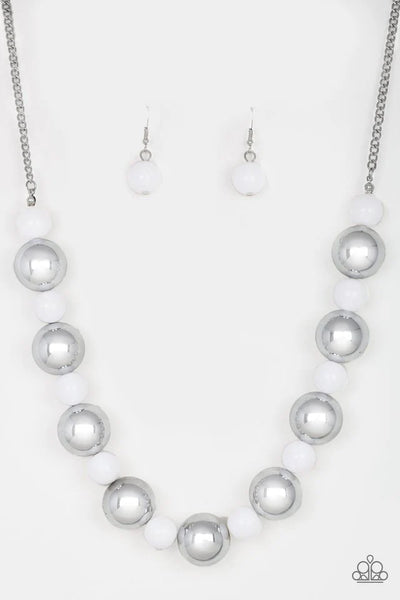 Polished white beads and dramatic silver beads drape below the collar for a perfect pop of color. Features an adjustable clasp closure.