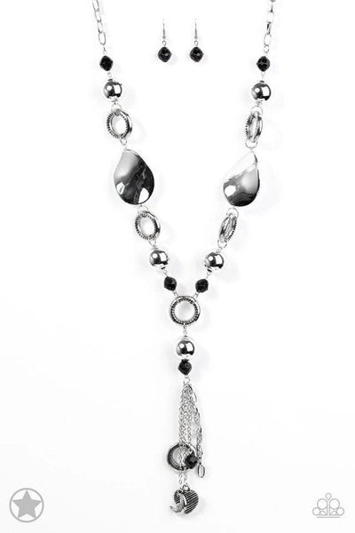This stunning Paparazzi Necklace Blockbuster, Total Eclipse Of the Heart in Silver, features a long chain adorned with black crystalized beads, curved silver plates with a pearly finish, and chunky silver rings leading to a charming tassel of chains and charms, including a crescent moon and heart. Sold as one individual necklace with a pair of matching earrings, this classic design is a favorite among Paparazzi customers. Pair it with a shirt and jeans for a casual, timeless look.