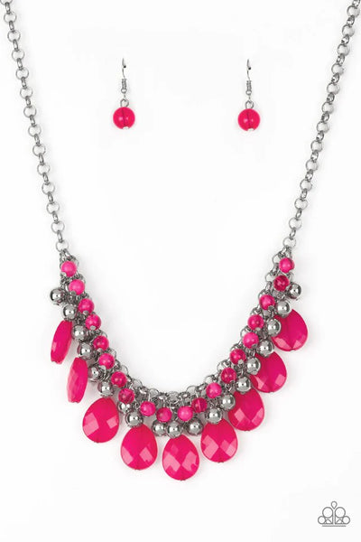 A row of cloudy pink beads gives way to a row of shiny silver beads. Brushed in an opalescent finish, pink teardrops cascade from the bottom of bold interlocking silver chains, creating a dramatically colorful fringe. Features an adjustable clasp closure.