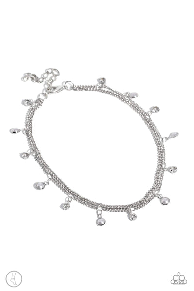 A fringe of dainty pearls and white gems pressed into sleek silver frames wraps around the ankle on a dainty silver chain, creating a glittery, oceanic statement. A second dainty silver chain adds a high-sheen layer for a refined finish. Features an adjustable clasp closure.
